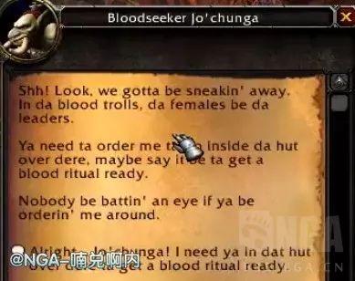 Jo chunga是赞达拉派来的眼线,也发现了一些鲜血巨魔的东西。现在要我们去引开敲鼓的其他巨魔,然后击杀被邪神腐化的蝙蝠loa神。顺便去击打,用皮鞭抽那些在进行鲜血巨魔仪式的苦工,看看仪式到底是什么样的。