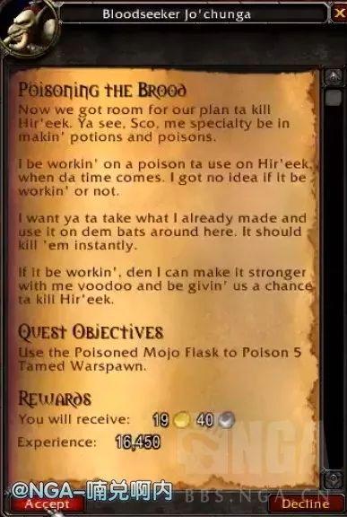 之后Jo chunga发现这些蝙蝠会破除我们的伪装,很危险。他研制了一些药水,可以毒死这些蝙蝠。并且我们要干掉3个鲜血巨魔营地的主力。